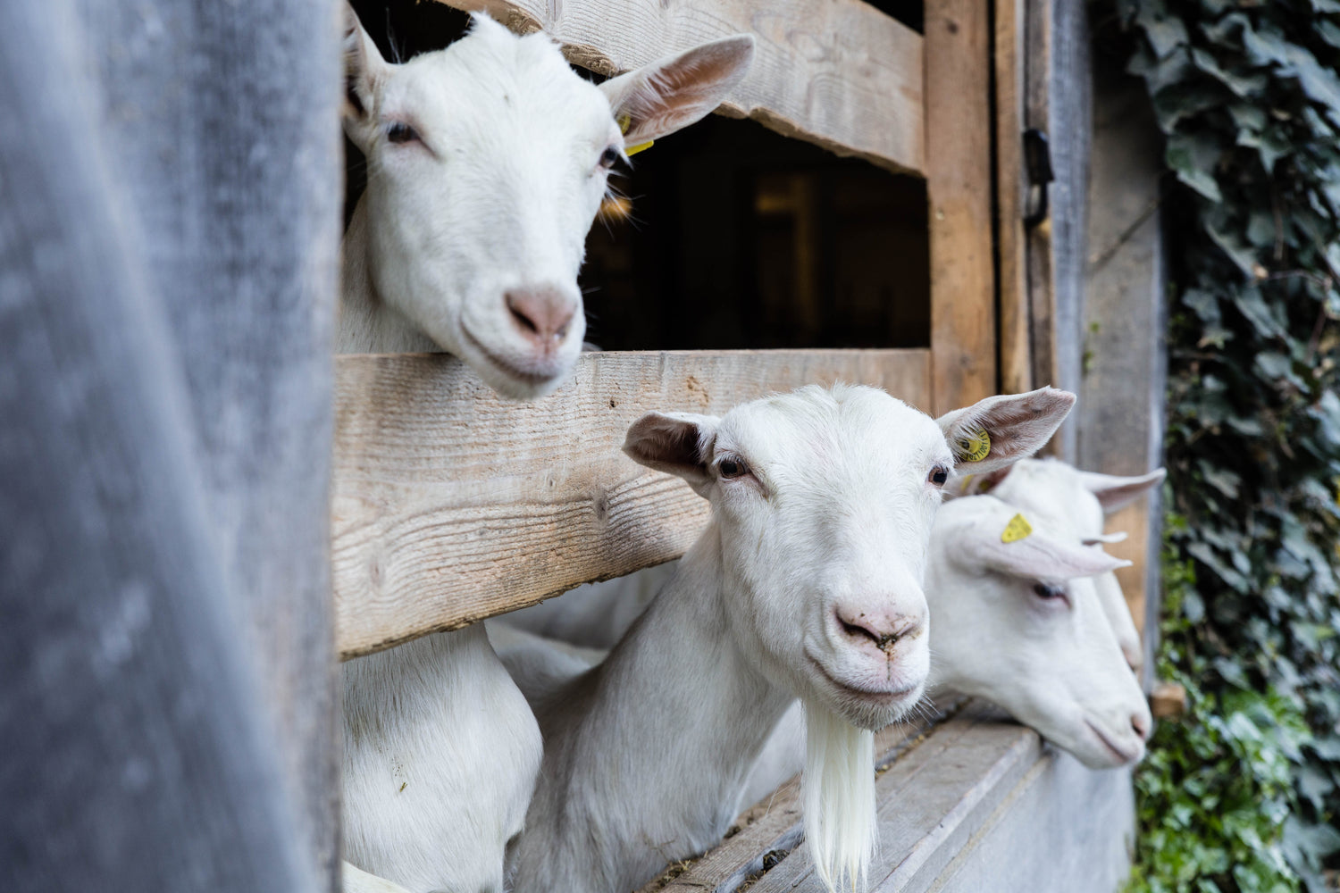 Die weißen Edelziegen liefern täglich frische Milch, welche in der Hofkäserei zu köstlichem Käse veredelt wird.